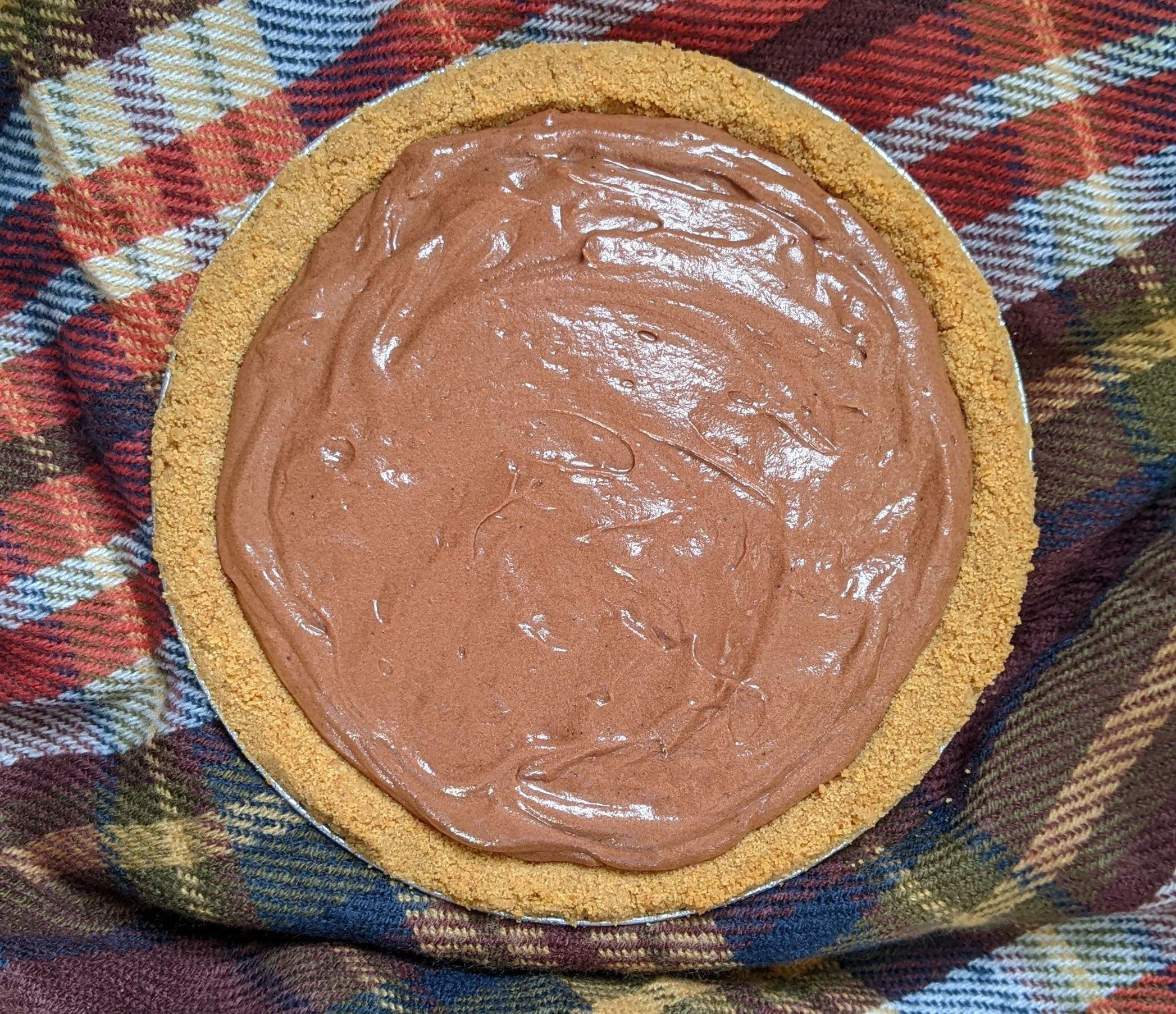 Place your very fluffy chocolate mixture into the cooled graham cracker crust. Smooth out the top of the pie with a rubber spatula.