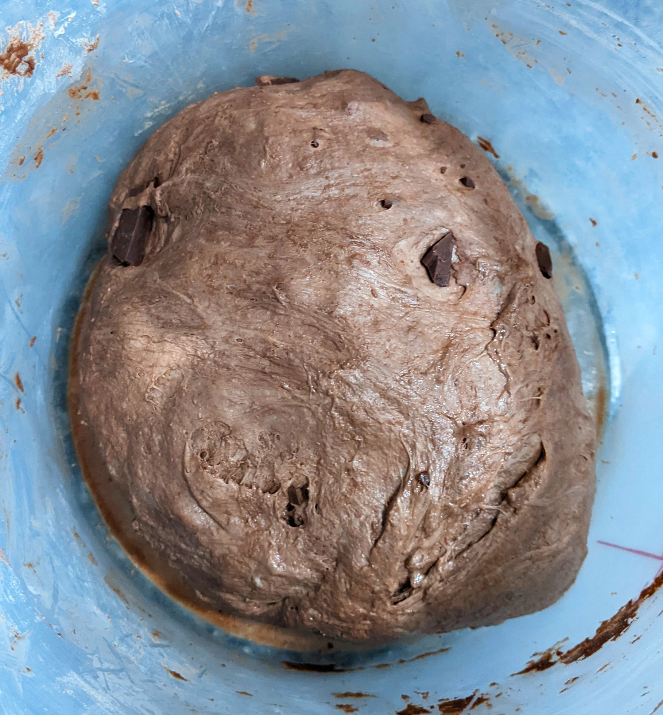 At the end of the stretching and folding you will notice that the dough will become more elastic and the chocolate should be evenly distributed throughout the dough.